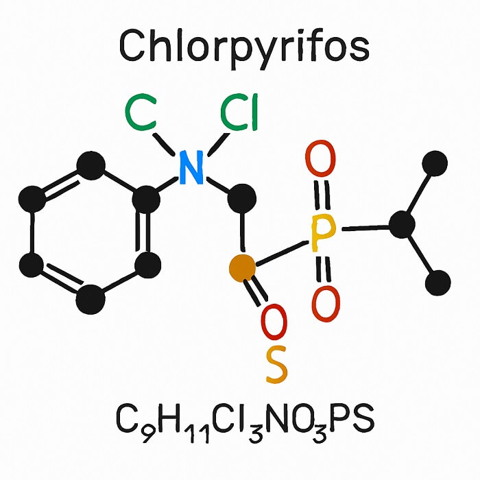 Структура: O,O-диэтил-O-(3,5,6-трихлор-2-пиридил)-фосфоротиоат — фосфорорганическое соединение, содержащее атом серы в положении тиоата и три атома хлора в пиридиновом кольце.